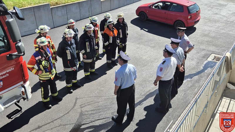 Im Anschluss erfolgte eine Einsatzübung nach Feuerwehrdienstvorschrift 3. Dabei musste die Gruppe eine Verkehrsabsicherung erstellen, die Erstversorgung/Betreuung der verunfallten Person übernehmen, den Brandschutz sicherstellen, die Ausleuchtung der Einsatzstelle vornehmen, Aufbau einer Ablagefläche für Einsatzmittel, Sichern/Unterbauen des Fahrzeugs, sowie eine Personenbefreiung durch Vornahme von Spreizer und Schneidgerät durchführen.